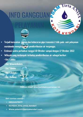 Disampaikan Kepada Pelanggan Pdam Tirta Anoa Kota Kendari Khusus Pengguna Sumber Air Unit Mataboundu. Pendistribusian Air bersih terhenti disebabkan oleh rusaknya pompa tekan intake produksi Unit Matabondu dan bocornya pipa ...