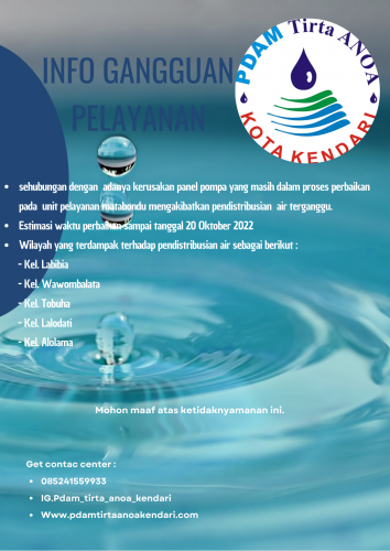 Disampaikan Kepada Pelanggan Pdam Tirta Anoa Kota Kendari Khusus Pengguna Sumber Air Mataboundu. Pendistribusian Air bersih terhenti di sebabkan adanya kerusakan panel pompa yang masih dalam proses perbaikan. Estimasi&...