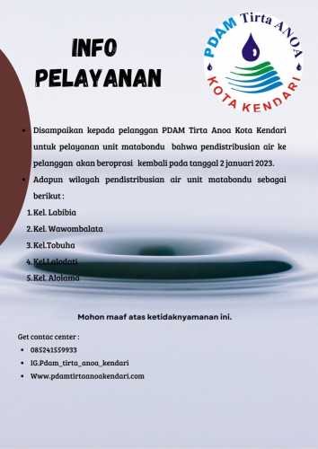 Disampaikan Kepada Pelanggan Pdam Tirta Anoa Kota Kendari Khusus Pengguna Sumber Air Unit Mataboundu. Pendistribusian Air bersih kepada pelanggan akan kembali beroperasi pada tanggal 2 Januari 2023. Adapun wilayah Pendistribusian Air bersih ...