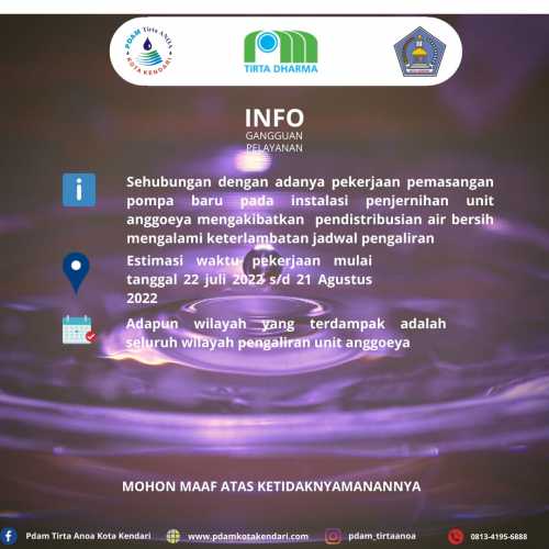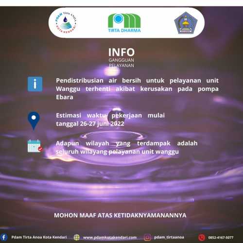 Disampaikan kepada Pelanggan PDAM Tirta Anoa Kota Kendari khusus wilayah Pelayanan Sumber Intake Pohara Kec. Sampara Kab. Konawe. Pendistribusian air bersih terhenti disebabkan terjadinya kerusakan pompa intake Pohara. Estimasi ...