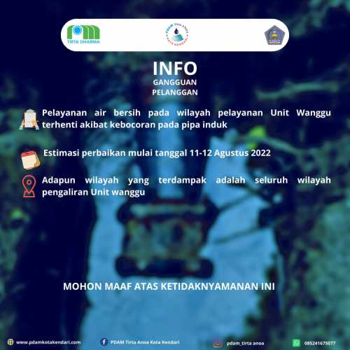 Disampaikan Kepada Pelanggan Pdam Tirta Anoa Kota Kendari Khusus Pengguna Sumber Air Unit Wanggu, Kec.Baruga Pendistribusian Air bersih pada pelanggan terhenti disebabkan bocornya pipa Induk Estimasi waktu perbaikan ...