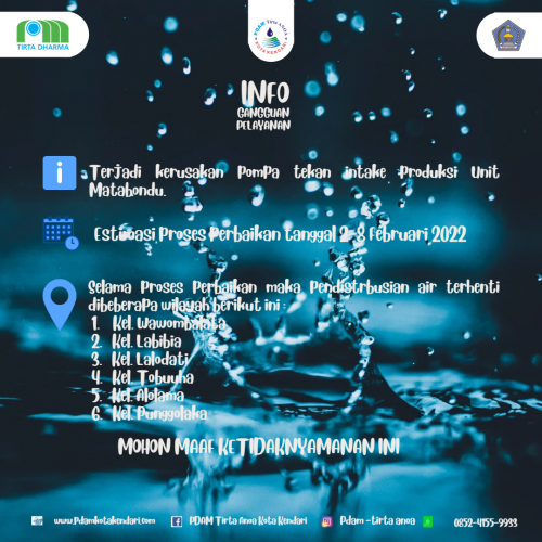 Disampaikan Kepada Pelanggan Pdam Tirta Anoa Kota Kendari Khusus Pengguna Sumber Air Unit Mataboundu. Pendistribusian Air bersih terhenti disebabkan oleh rusaknya pompa tekan intake produksi Unit Matabondu pada hari selasa, 1 ...