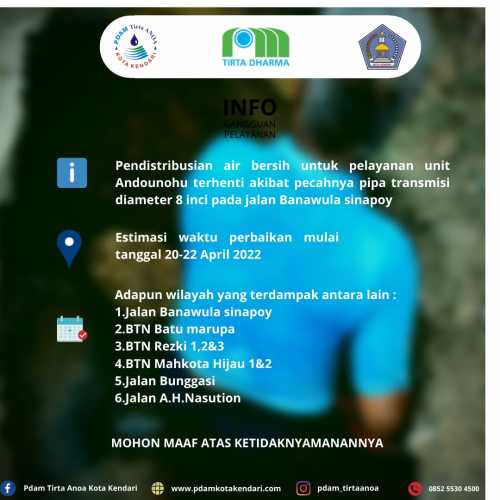 Disampaikan kepada Pelanggan PDAM Tirta Anoa Kota Kendari khusus wilayah Pelayanan Unit Anduonohu. Pendistribusian Air bersih terhenti akibat pecahnya pipa transmisi diameter 8 inci pada jalan Banawula Sinapoy. Estimasi ...