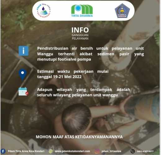 Disampaikan Kepada Pelanggan Pdam Tirta Anoa Kota Kendari Khusus Pengguna Sumber Air Unit Wanggu. Pendistribusian Air bersih terhenti disebabkan Sedimen pasir yang menutupi foodvalve pompa sejak hari rabu, 18 Mei 2022. ...